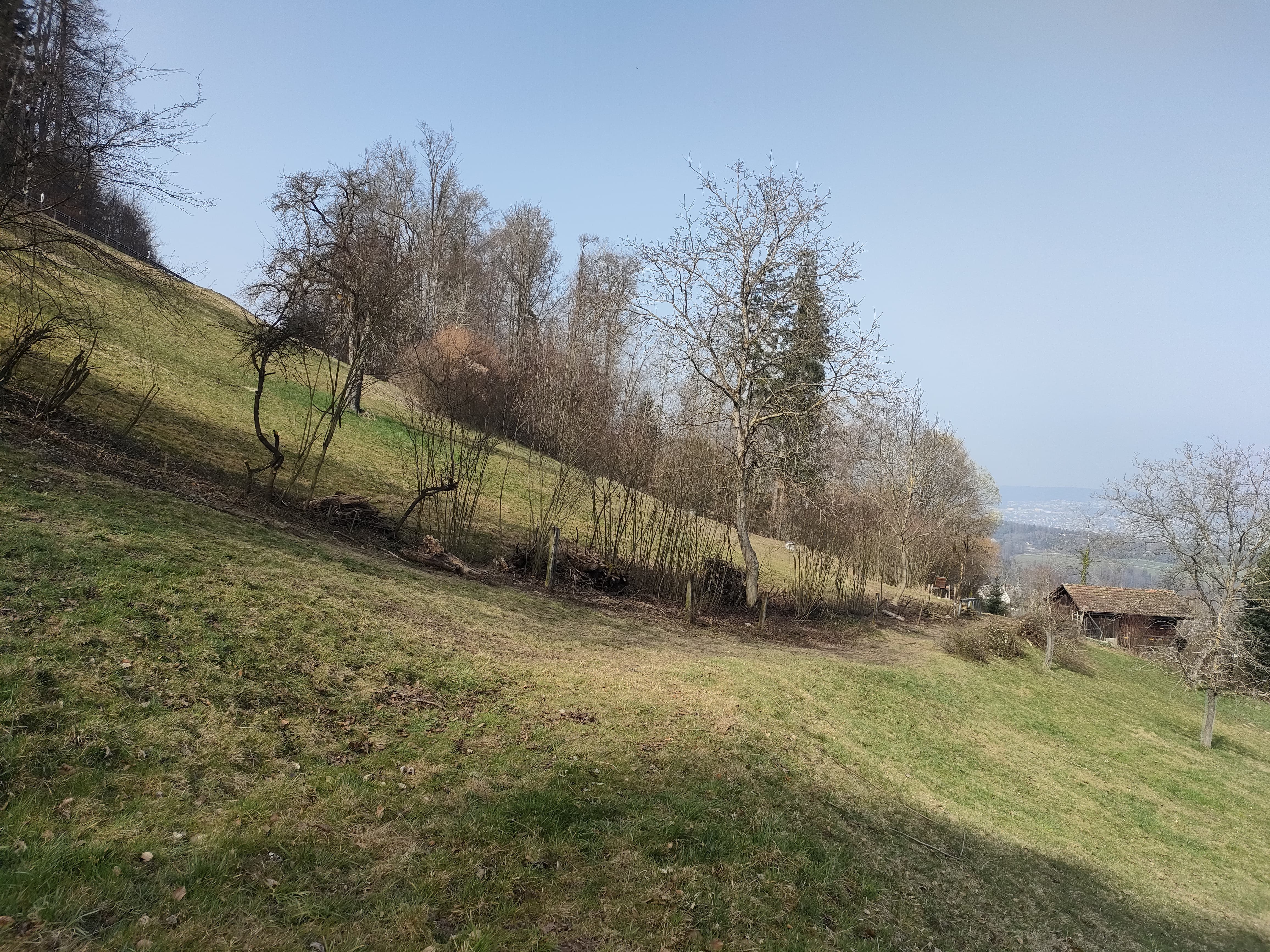 Es war ein erheblicher Aufwand. Auslichten der Hecke, dominierende Sträucher entfernen, Bäume fällen, alles häckseln und abführen, sowie den alten eingewachsenen Knotengitterzaun entfernen und das alles in steilem Gelände.